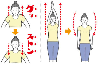 ◦ 息を吐きながら、一気に力を抜いて「ストン」と肩を落とします。