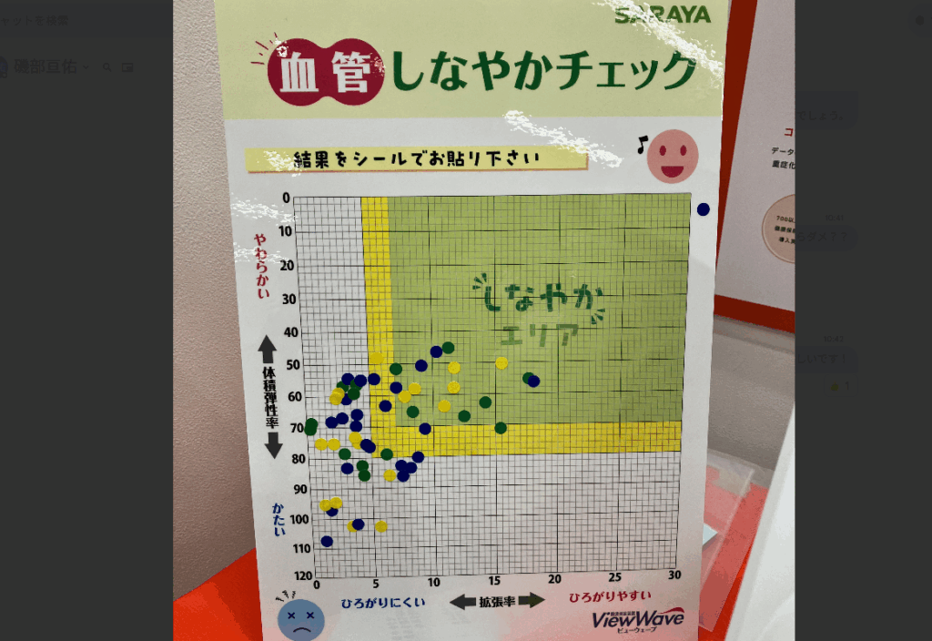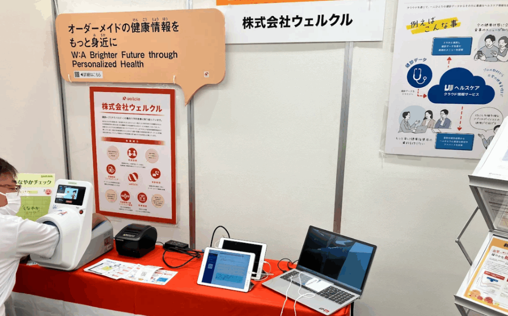 当社ブースでは、PHR解析エンジン「W」と脈波測定装置「ViewWave」をあわせて体験いただける展示を行いました。脈波測定では、データをもとに血管のしなやかさや広がりやすさといった状態を可視化し、測定結果を分布図として提示することで、自身の状態を直感的に把握できるようにしました。